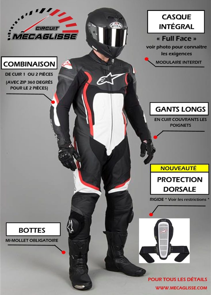 - Protection dorsale rigide obligatoire (certifiée Cat. II – EN 1621.2/2014) – Les protections incluses dans le manteau et ou ensemble 1 pièce ne sont pas acceptées. Nous allons vérifier le tout en même temps que l’inspection mécanique.